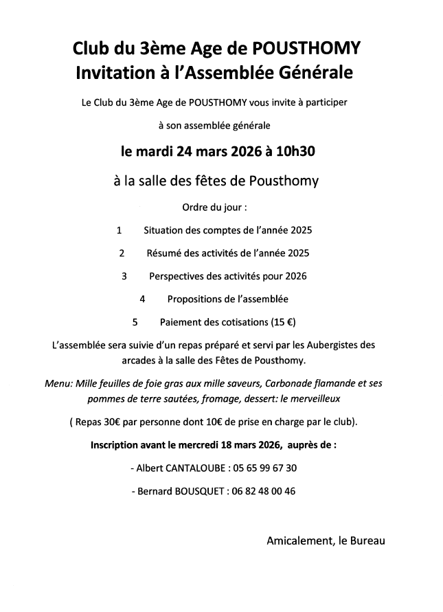 Le club du 3ème age de Pousthomy vous convie à son assemblée générale qui se tiendra le mardi 24 mars 2026 à 10h30 à la salle des fêtes.