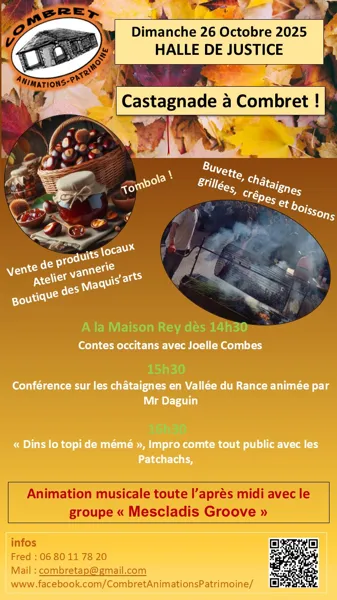 Venez passer une après-midi festive aux couleurs de l’automne. Au programme : castagnade, marché, animation musicales, marché autour des produits à base de châtaignes, conférence, boutique des artisans, conte et animations pour petits et grands !